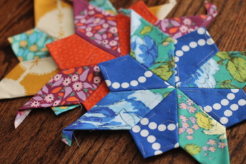 The wildflowers are blooming here in Texas – bluebonnets and indian paintbrush – a lush mix of deep blue, bright red, and yellow. So, I’m calling these stars wildflowers. Each wildflower is English Paper Pieced, my absolute favorite type of hand sewing.